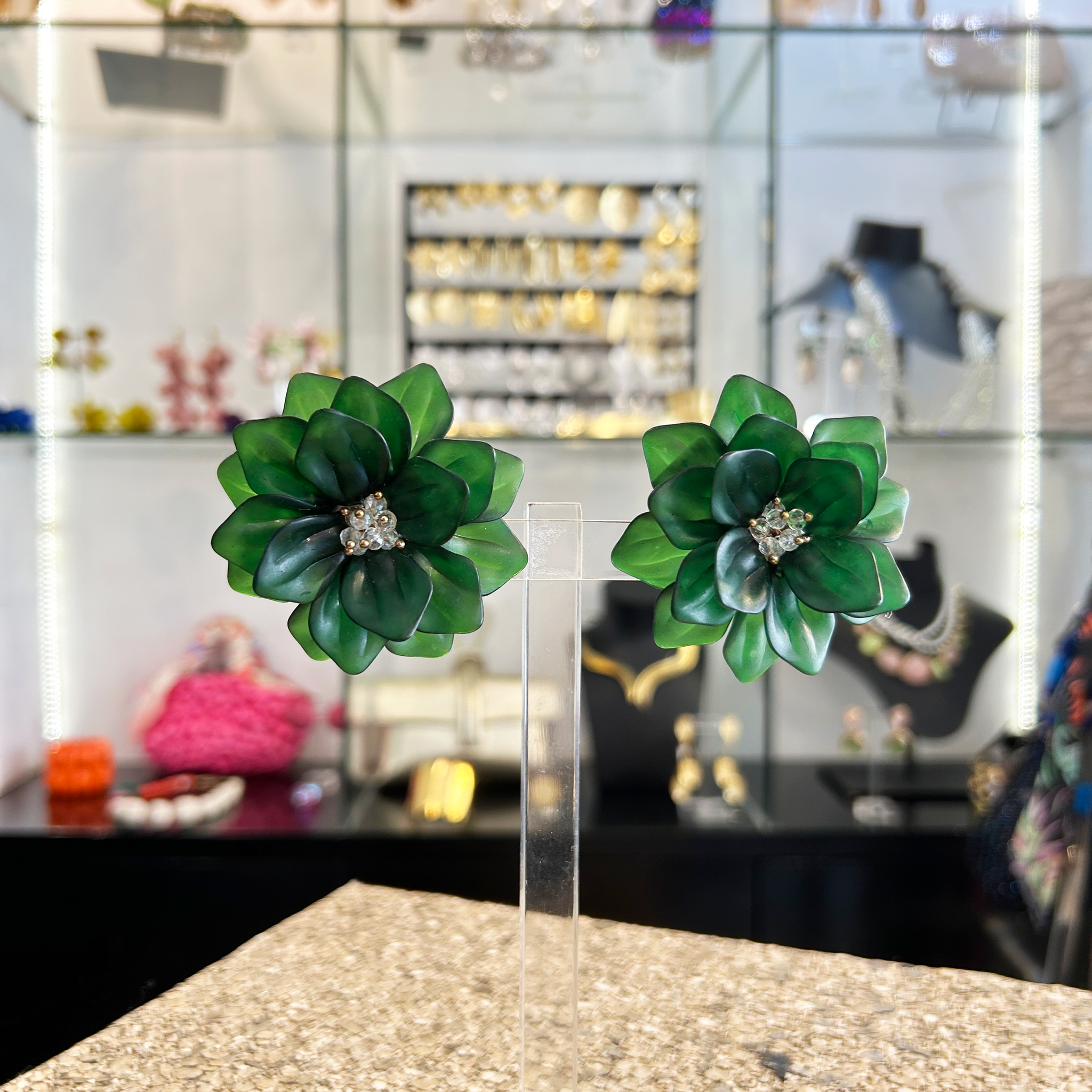 Caravanas de flores hechas en resina color verde. Aportan volumen y color!