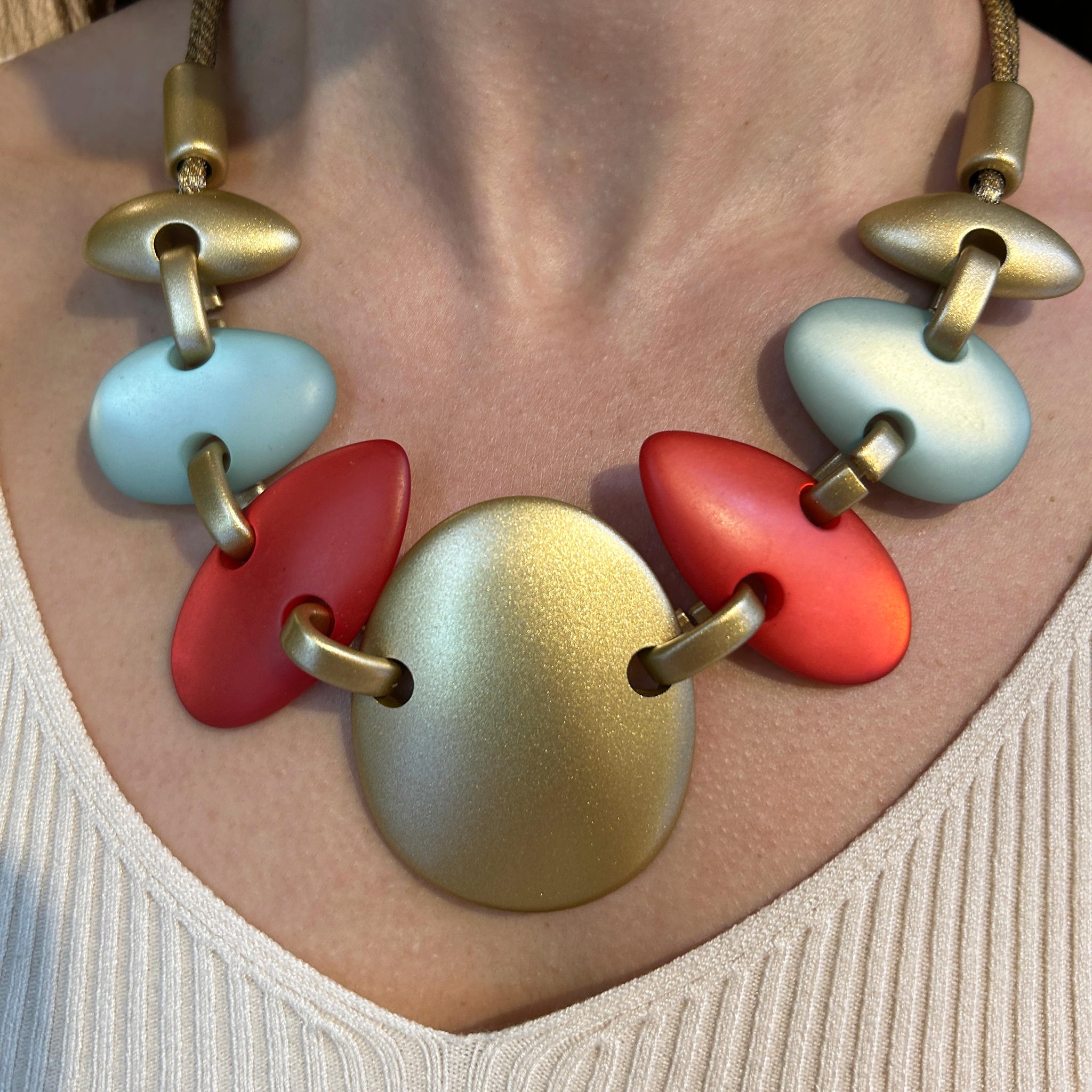 Collar corto diseñado por Fahoma, realizado en Italia.  Hecho en piezas ovaladas unidas con eslabones dorados combinando dorado, coral y turquesa.