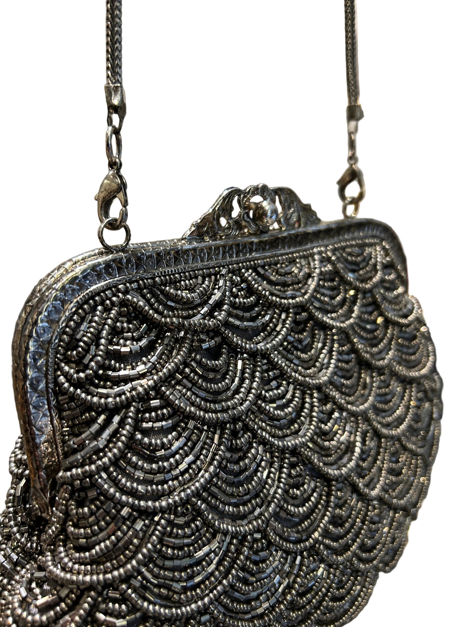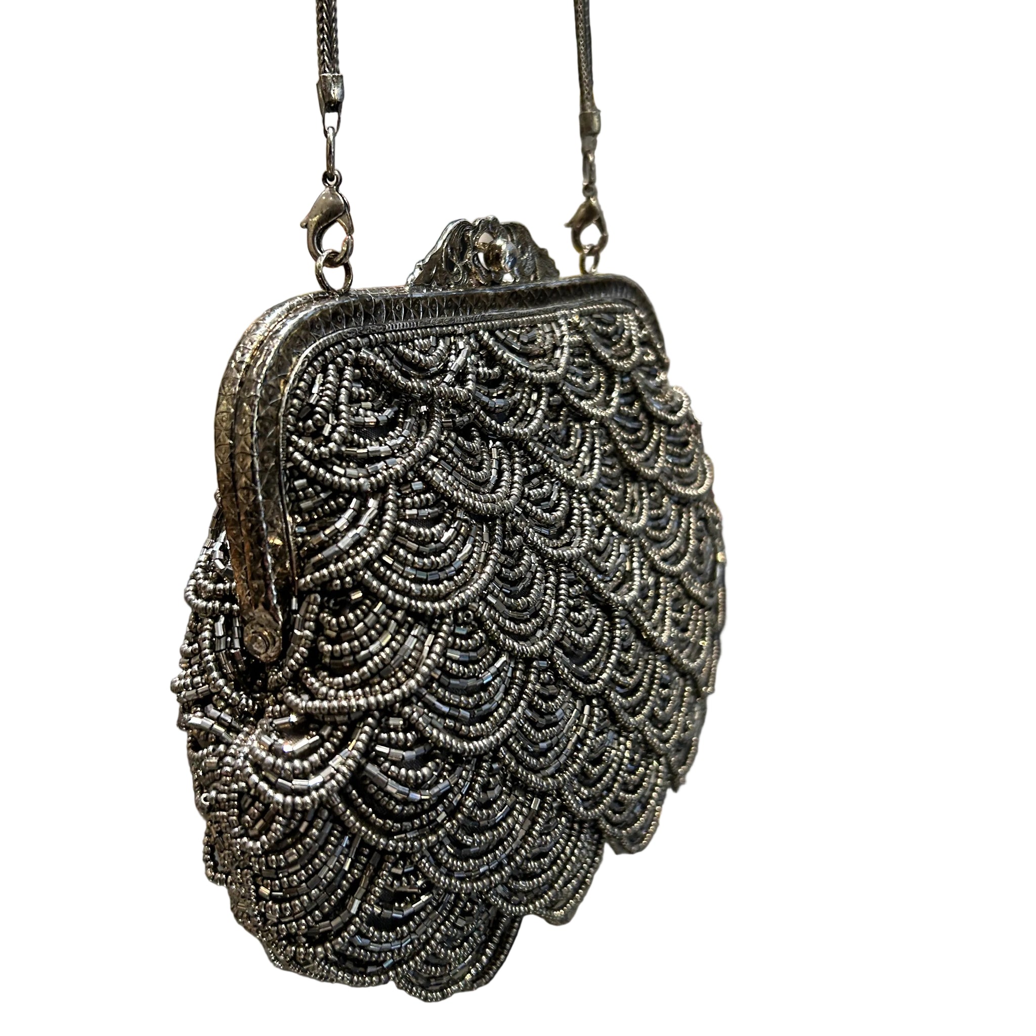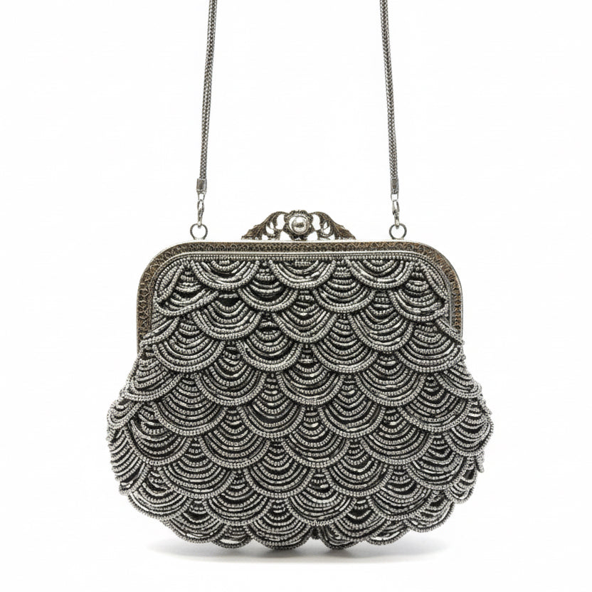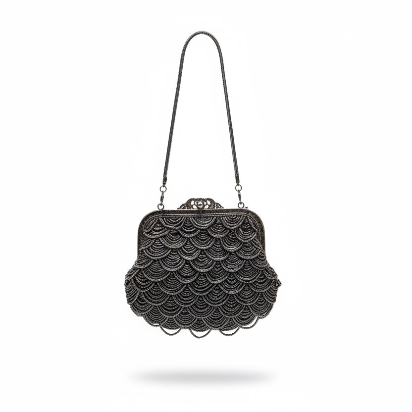 Bolso estilo vintage artesanal bordado en mostacillas peltre que captura la elegancia atemporal.