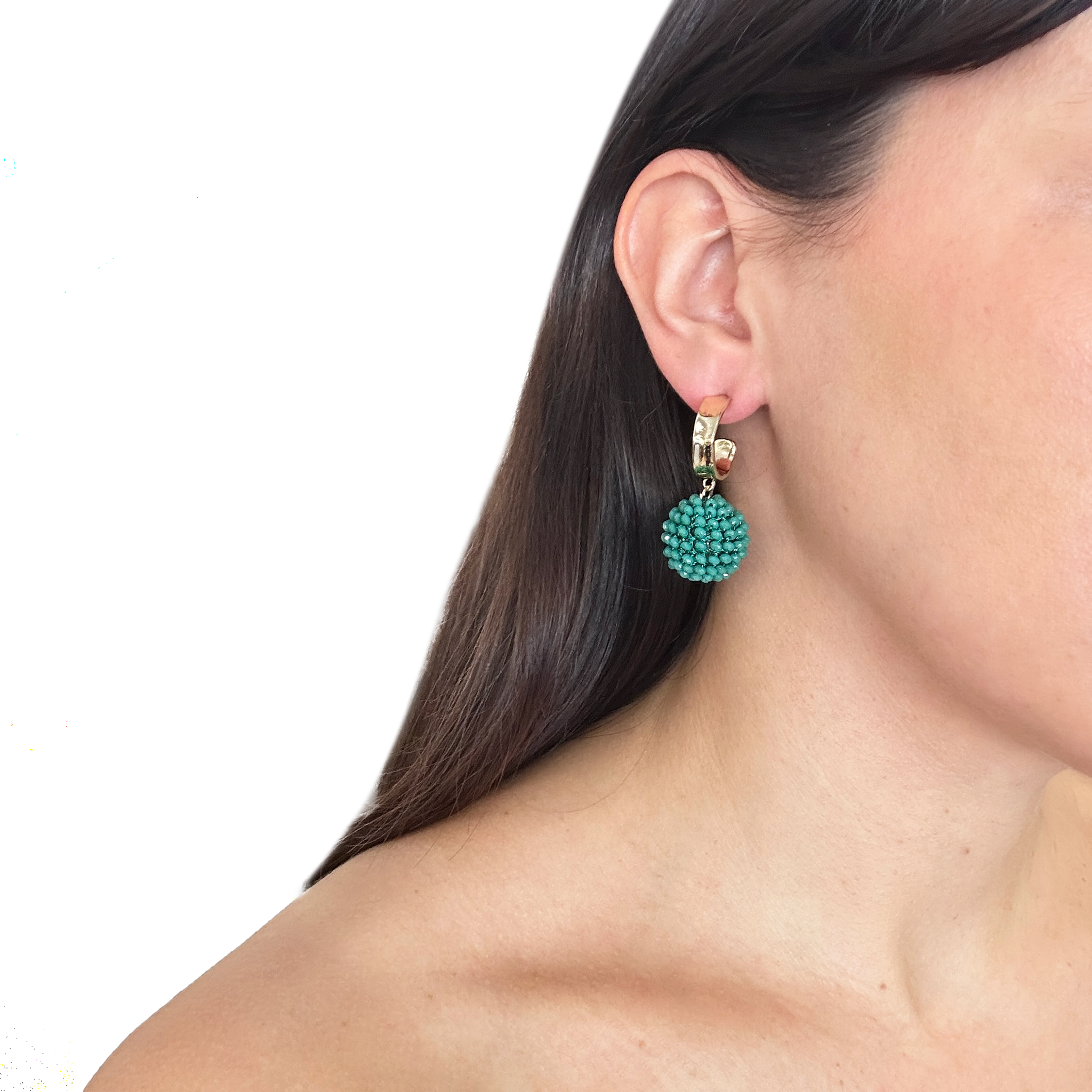 Caravanas super delicadas hechas de argollas doradas de metal con dije de esfera colgante bordada en cristales.