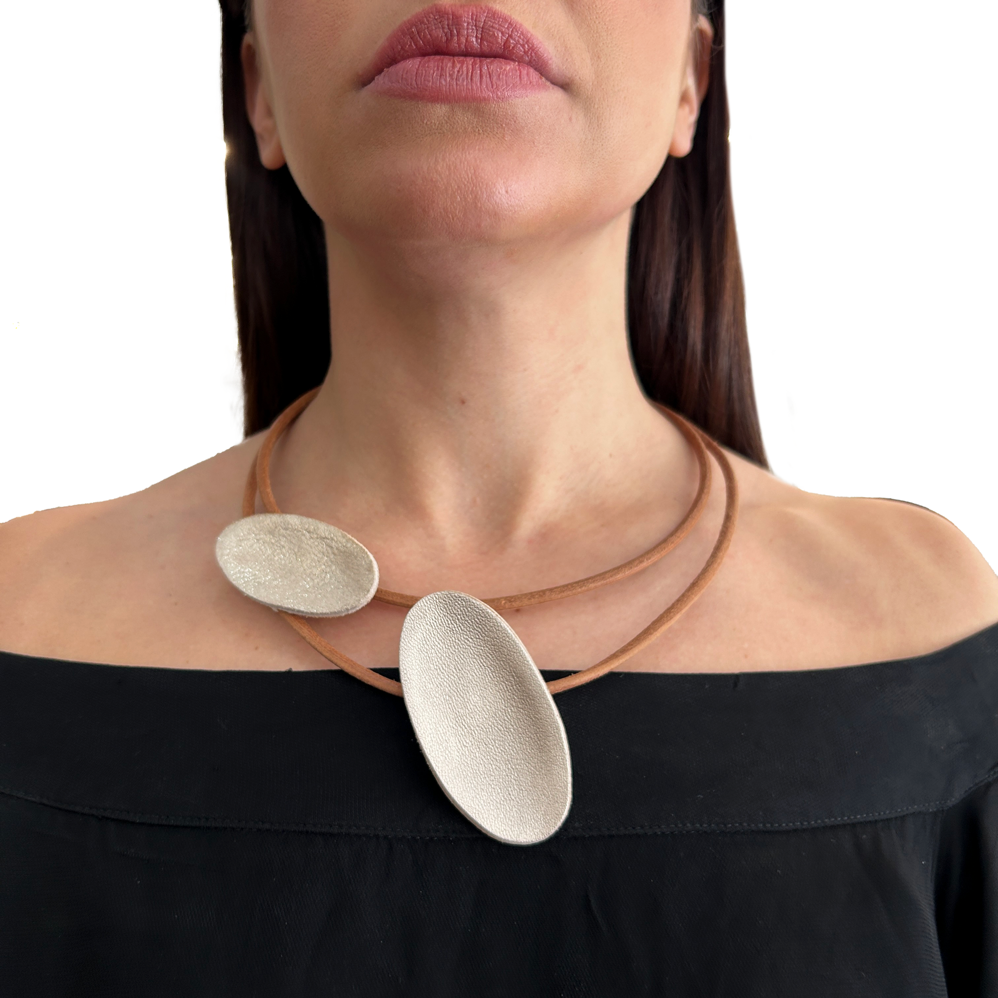 Collar corto hecho artesanalmente en Grecia, con cuero y tiento en tono marron y dorado.