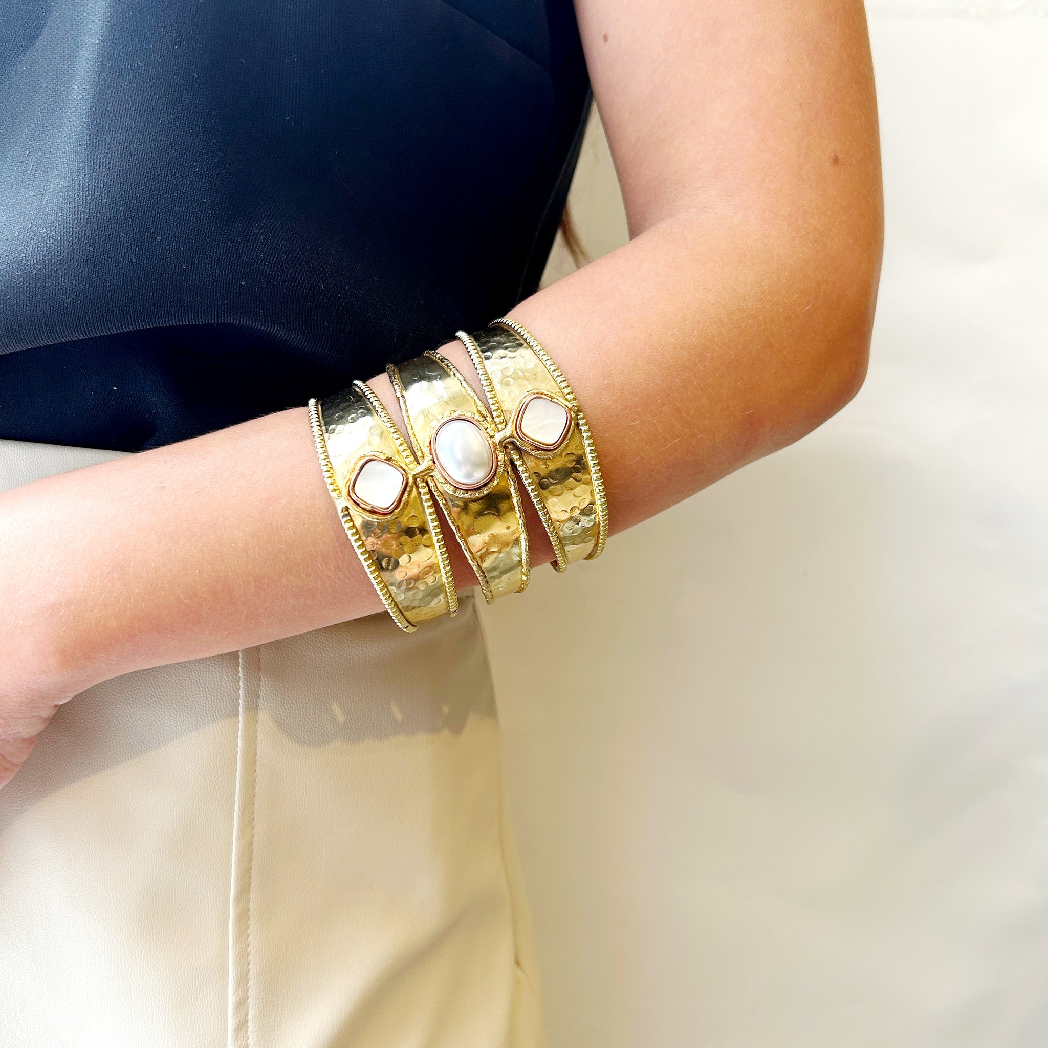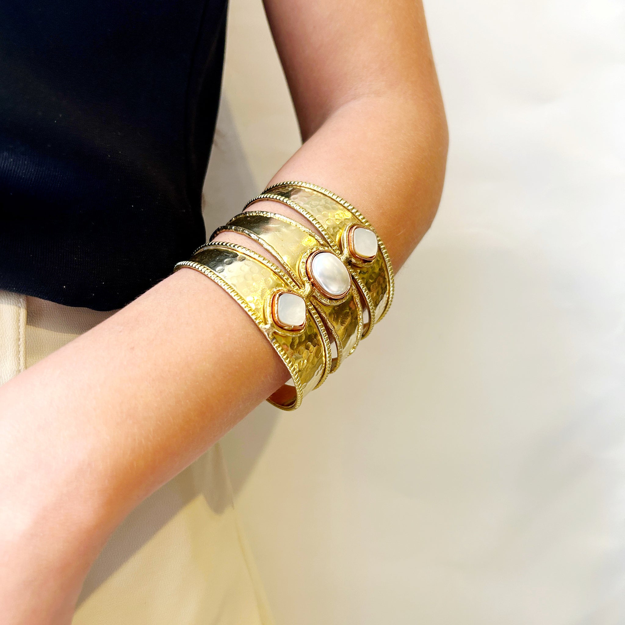 Brazalete hecho en bronce, con tres cortes y piedras engarzadas. Una pieza statement, fácil de combinar con looks de dia y de noche!