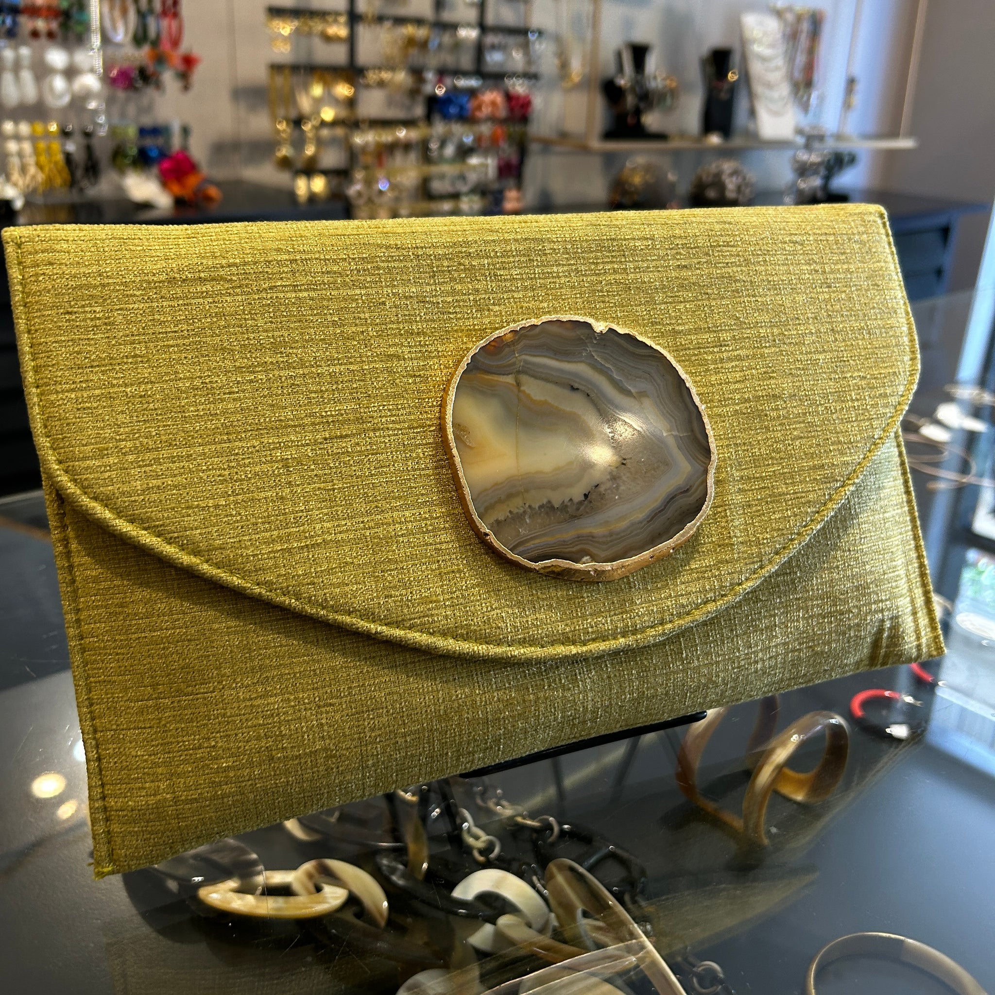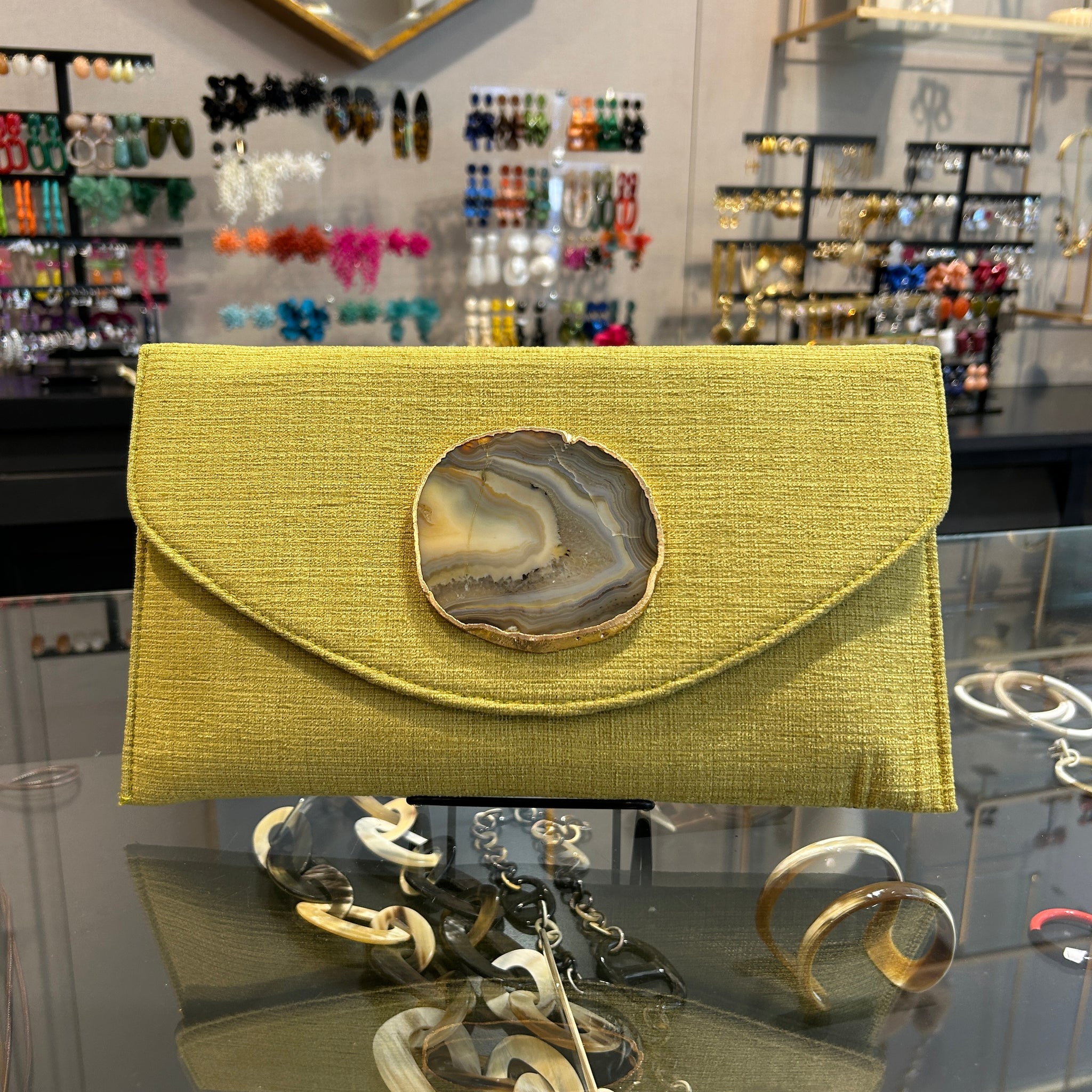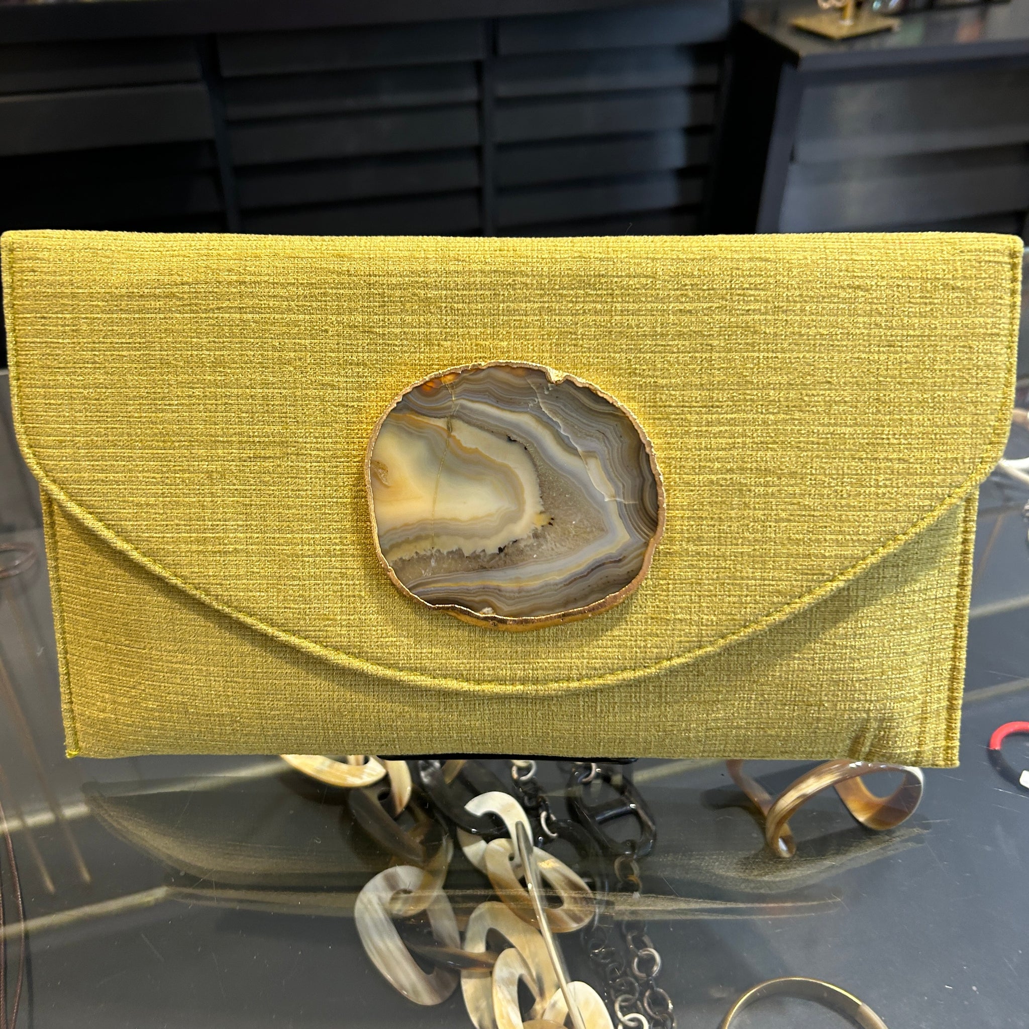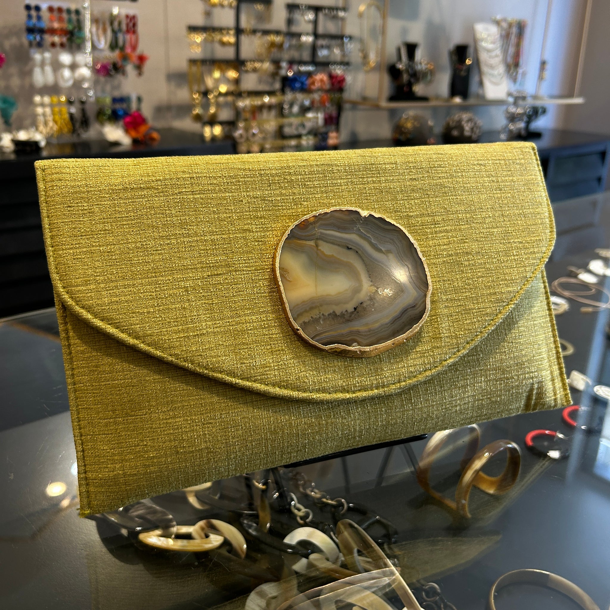 Sobre hecho artesanalmente en la India, en tejido mostaza con con aplique de piedra ágata a tono.