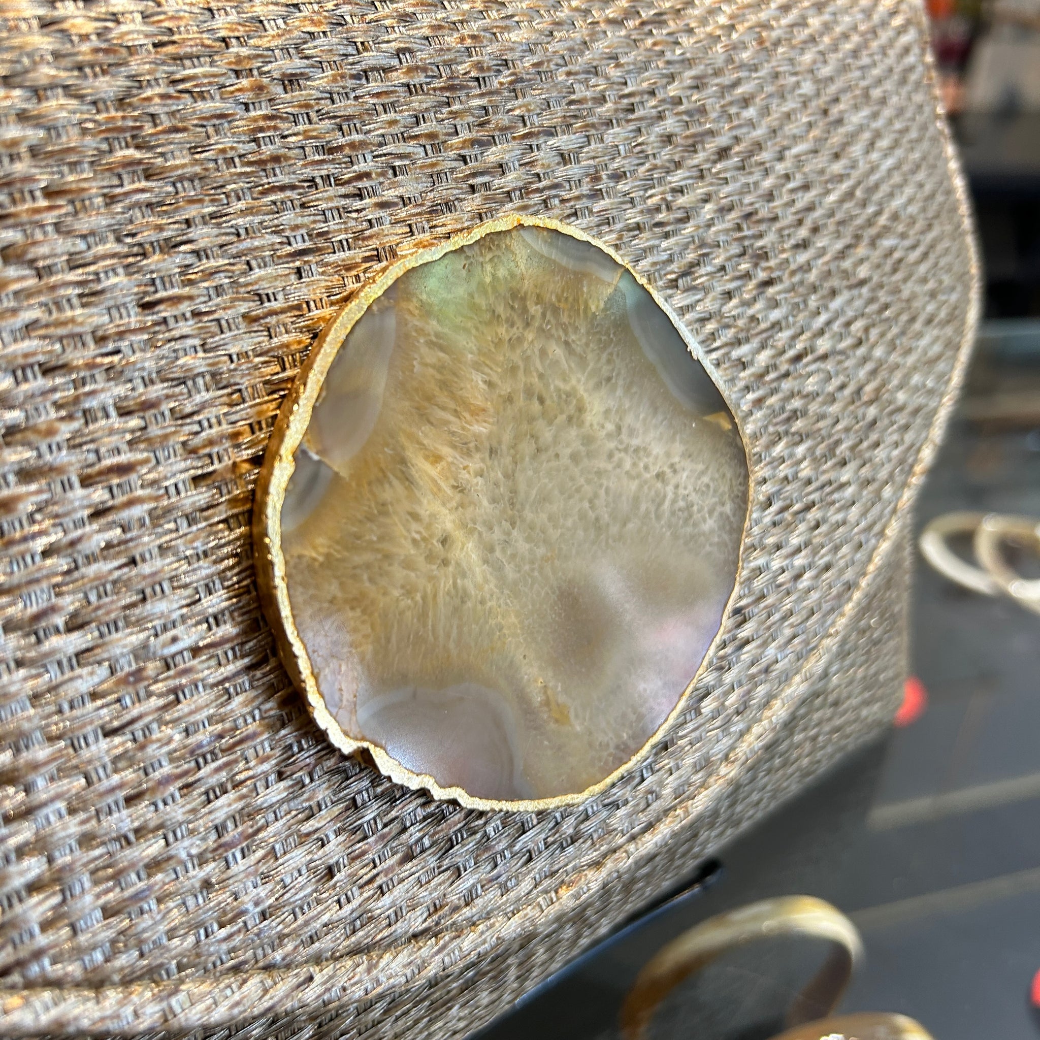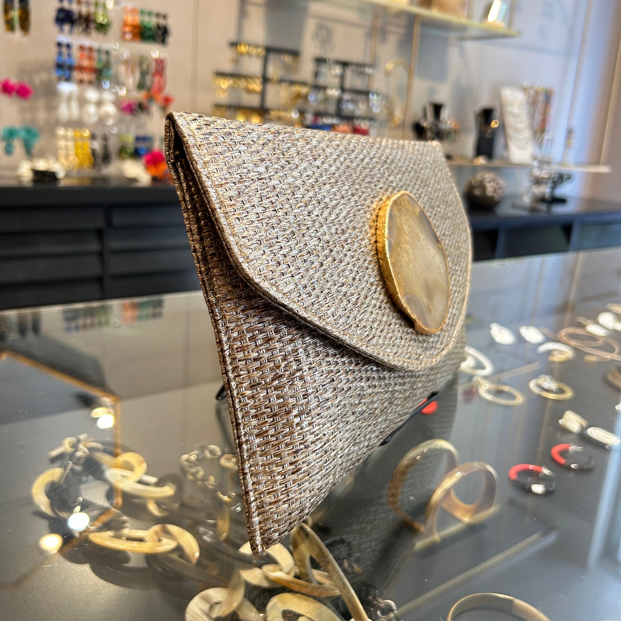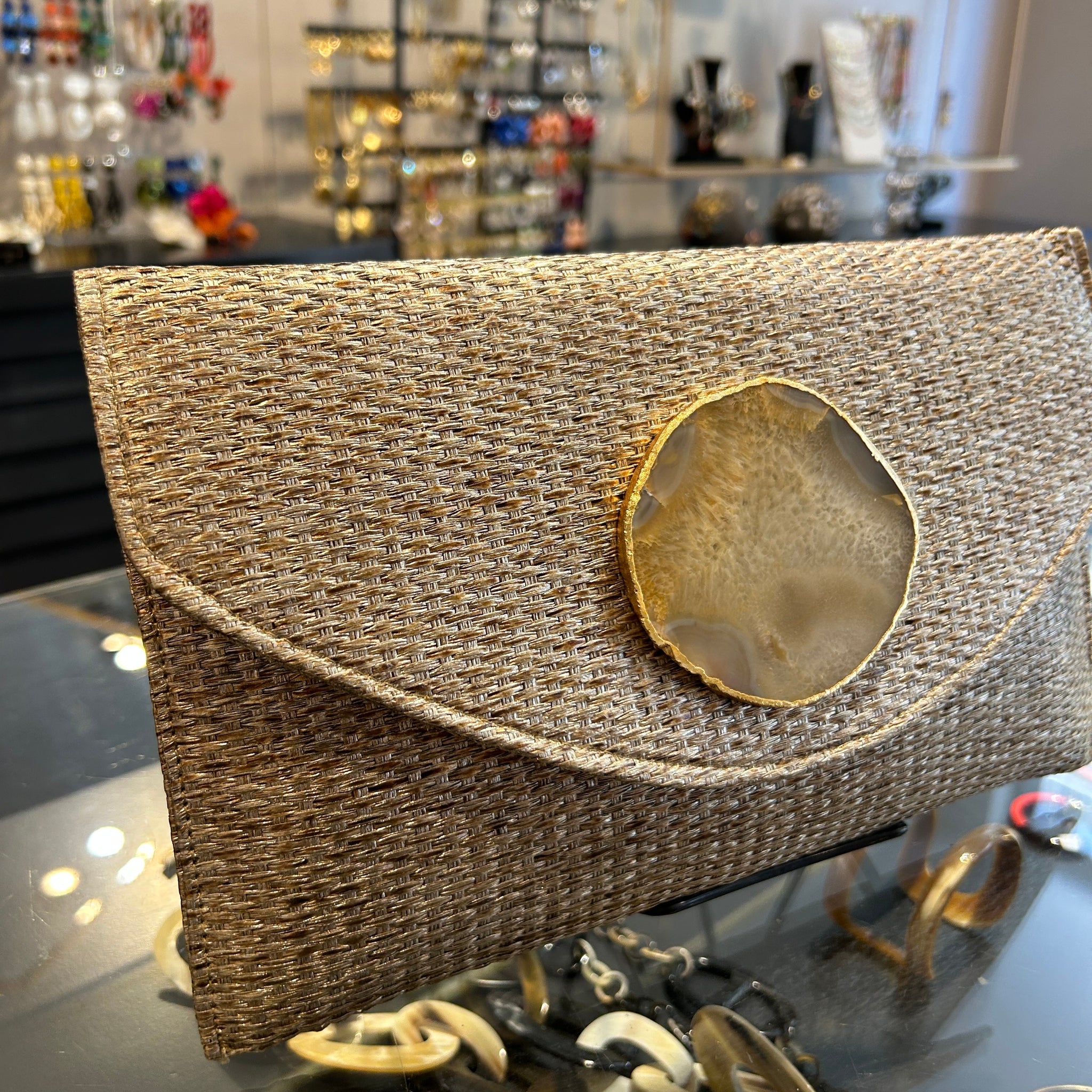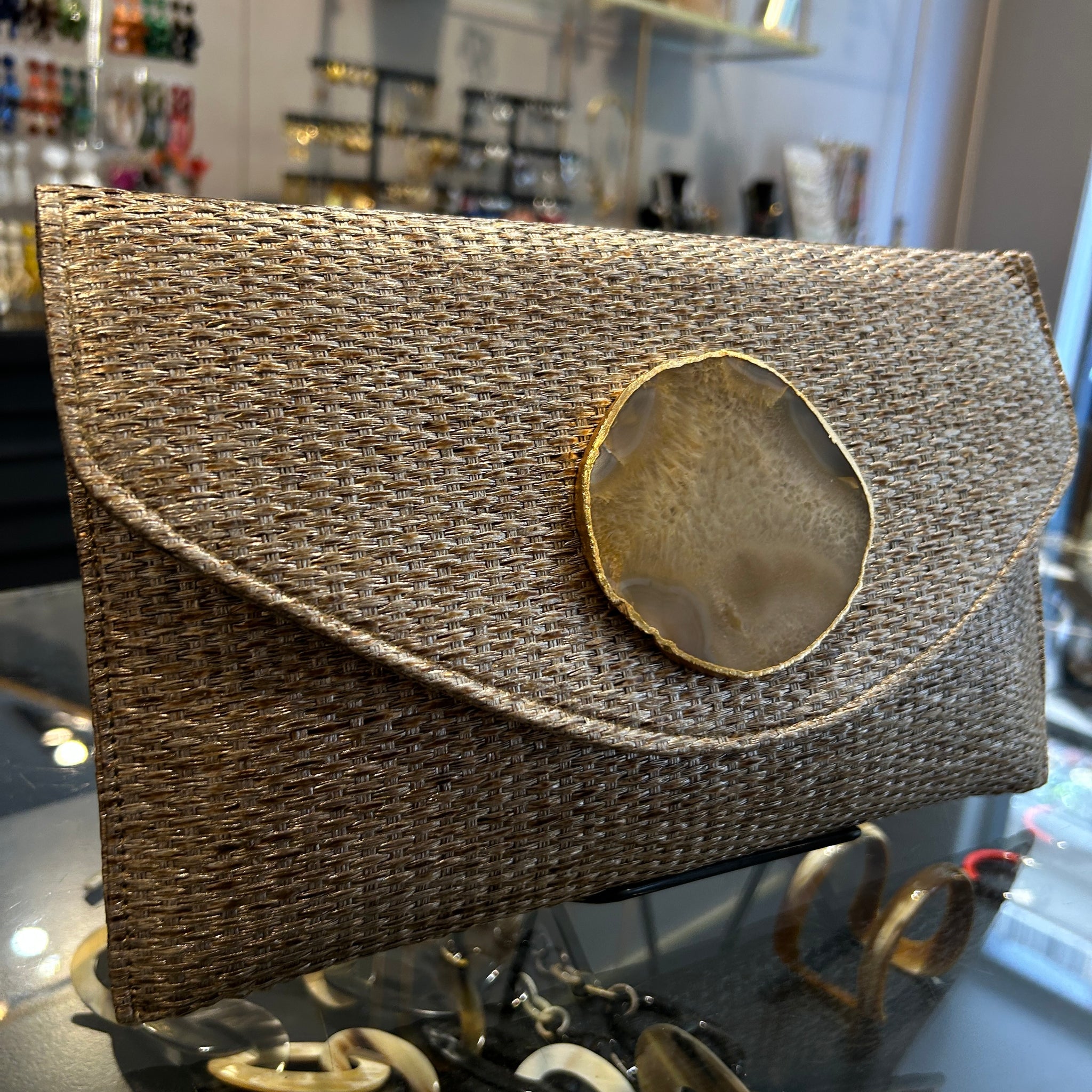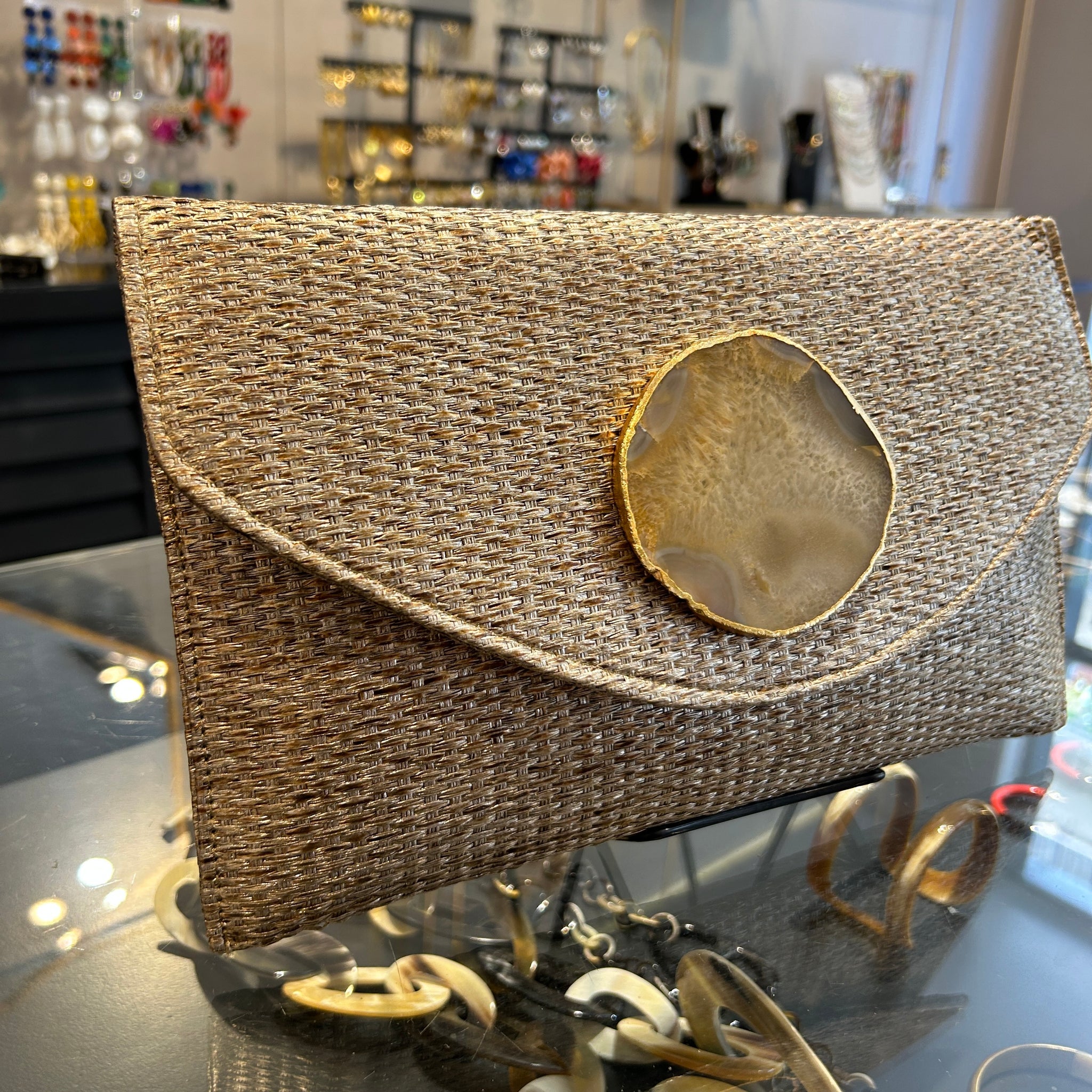 Sobre hecho artesanalmente en la India, en tejido tipo rafia con aplique de piedra ágata a tono.
