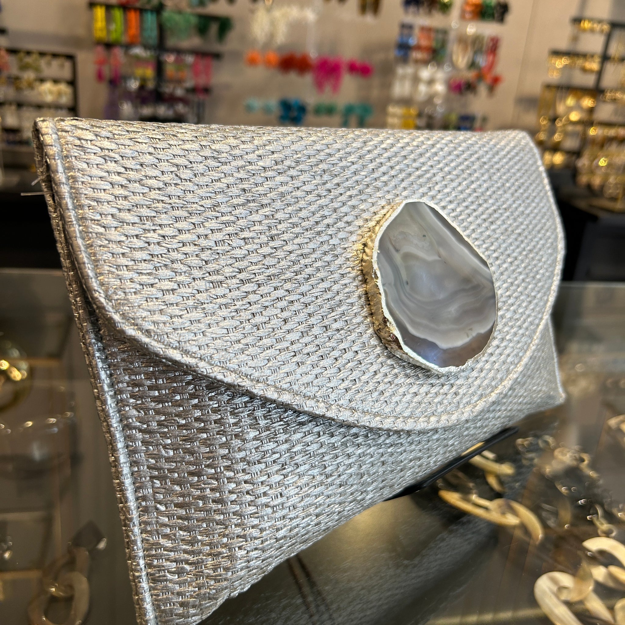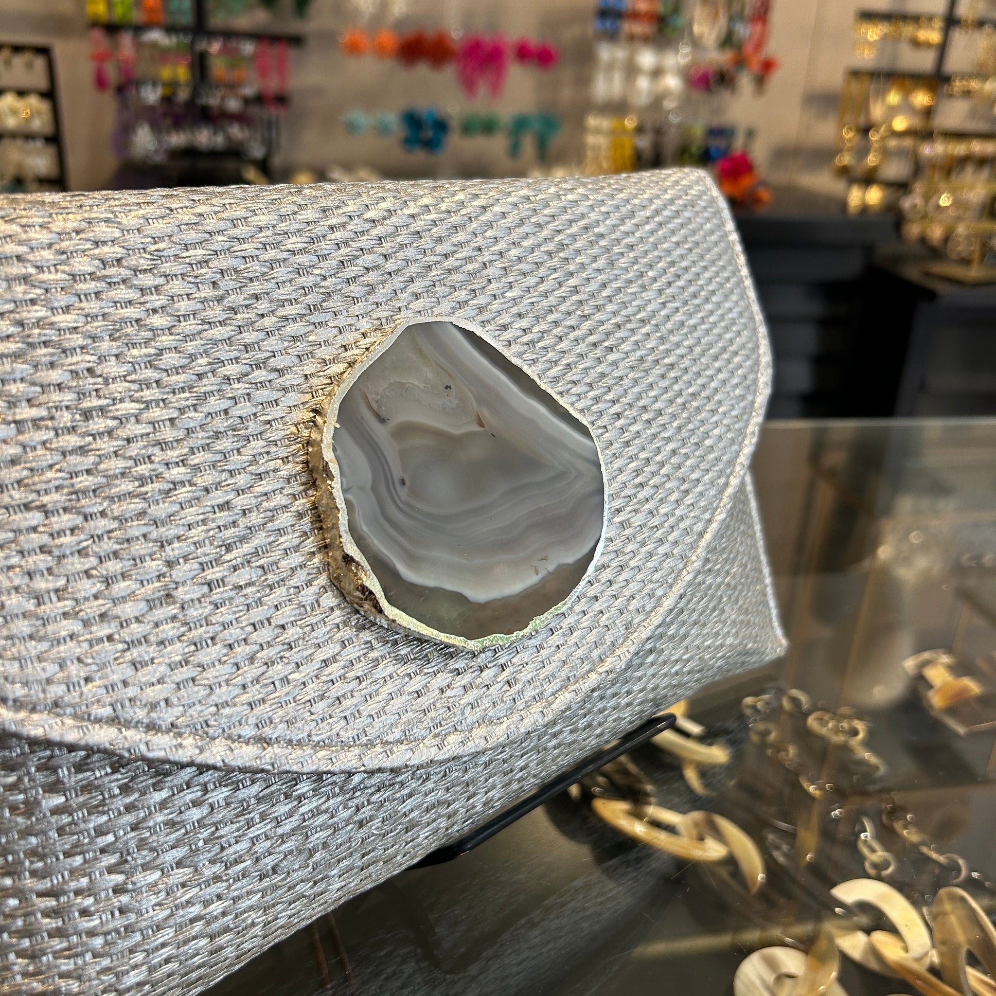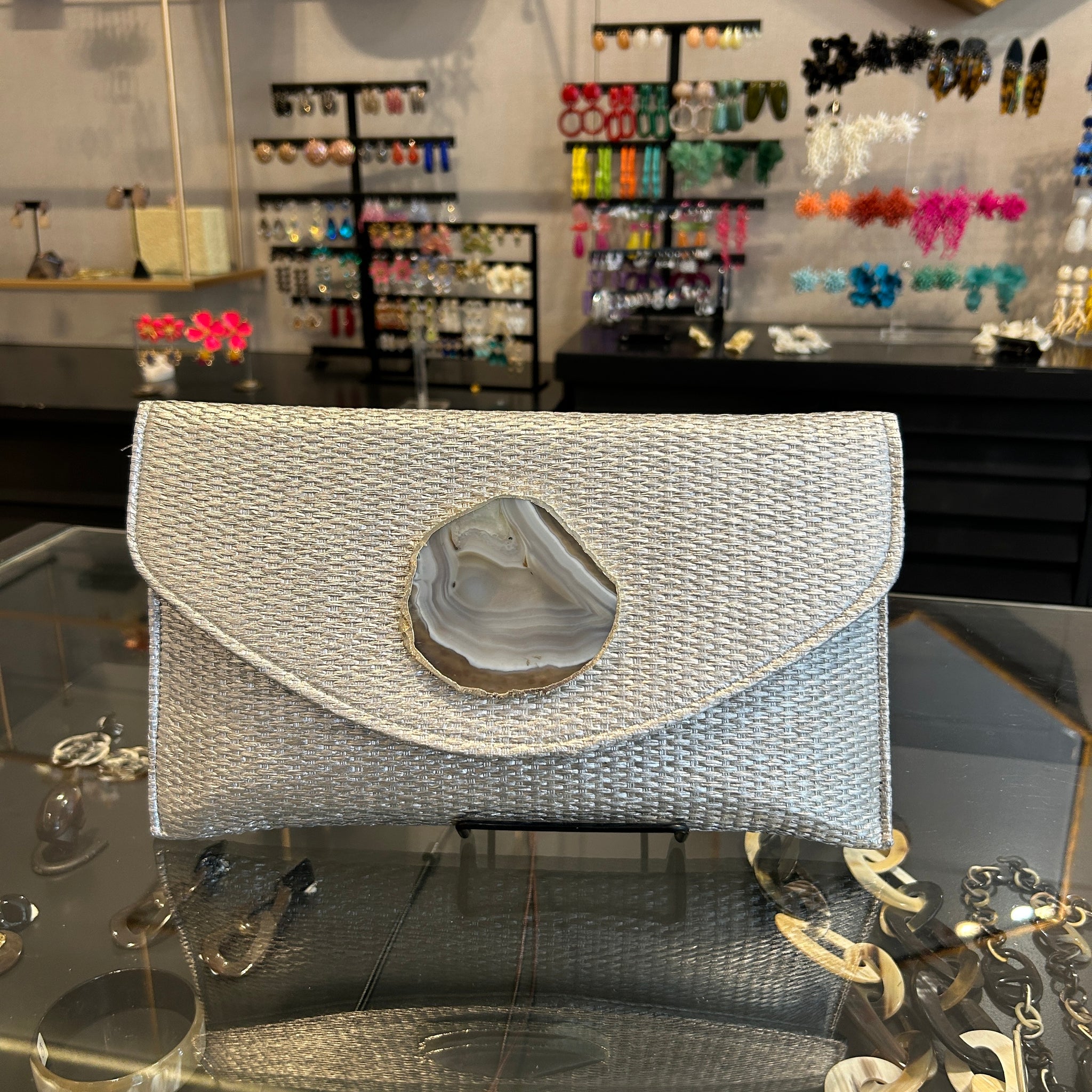 Sobre hecho artesanalmente en la India, en tejido tipo rafia  plateado  con aplique de piedra ágata a tono.