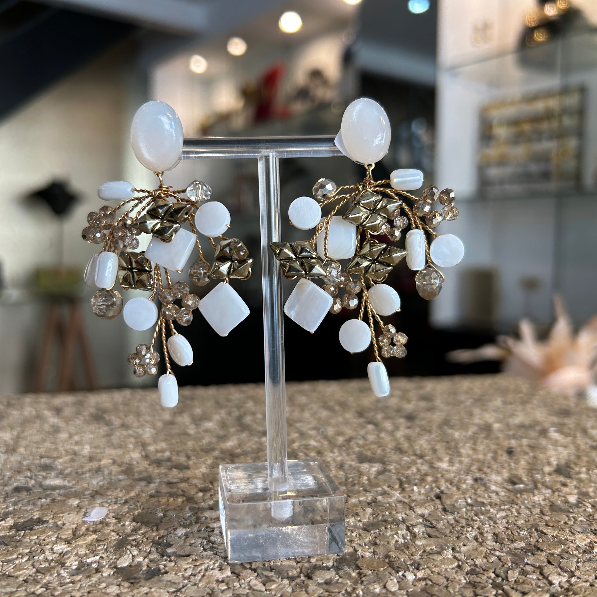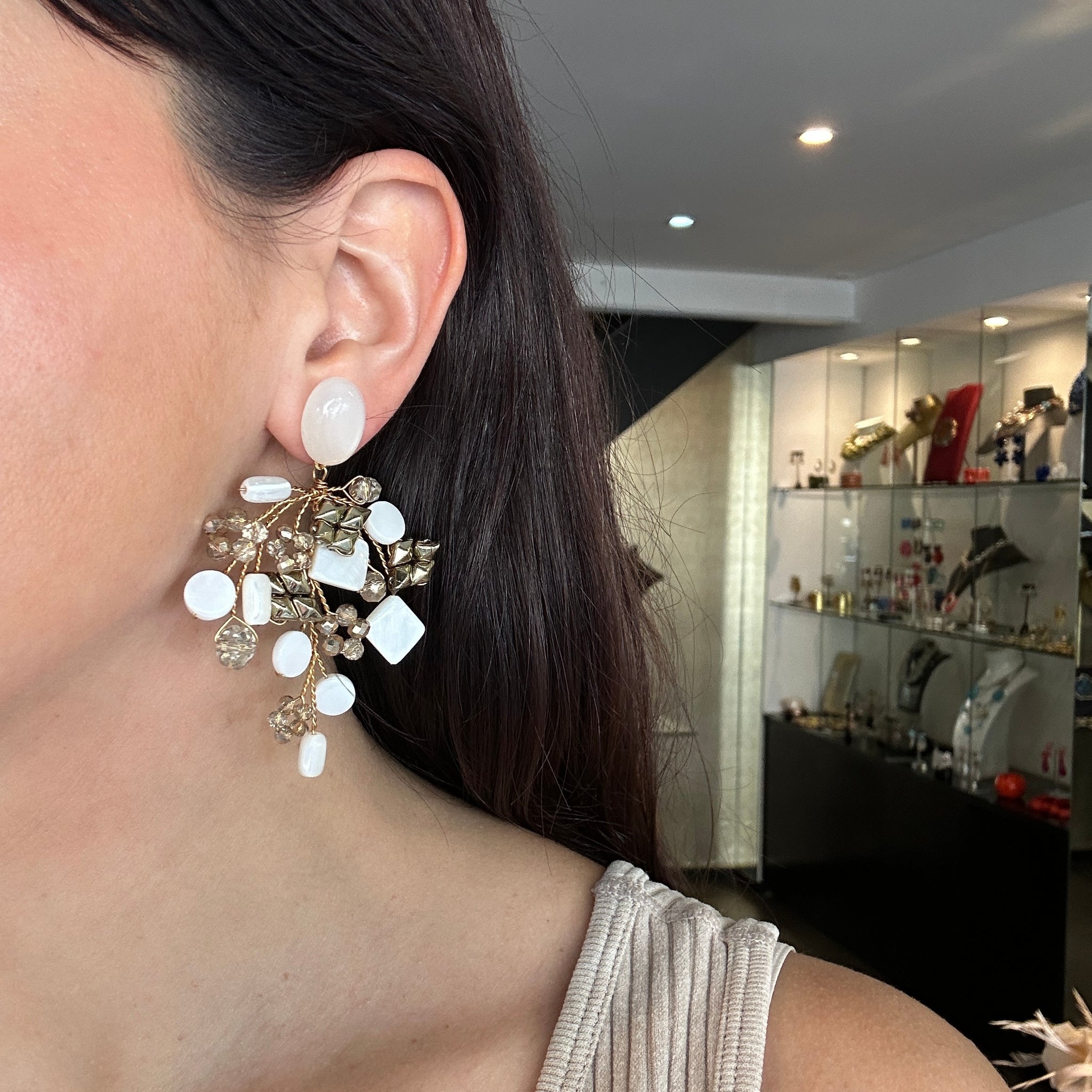 Caravanas hechas artesanalmente, en cristales color dorado suave y nacar blanco